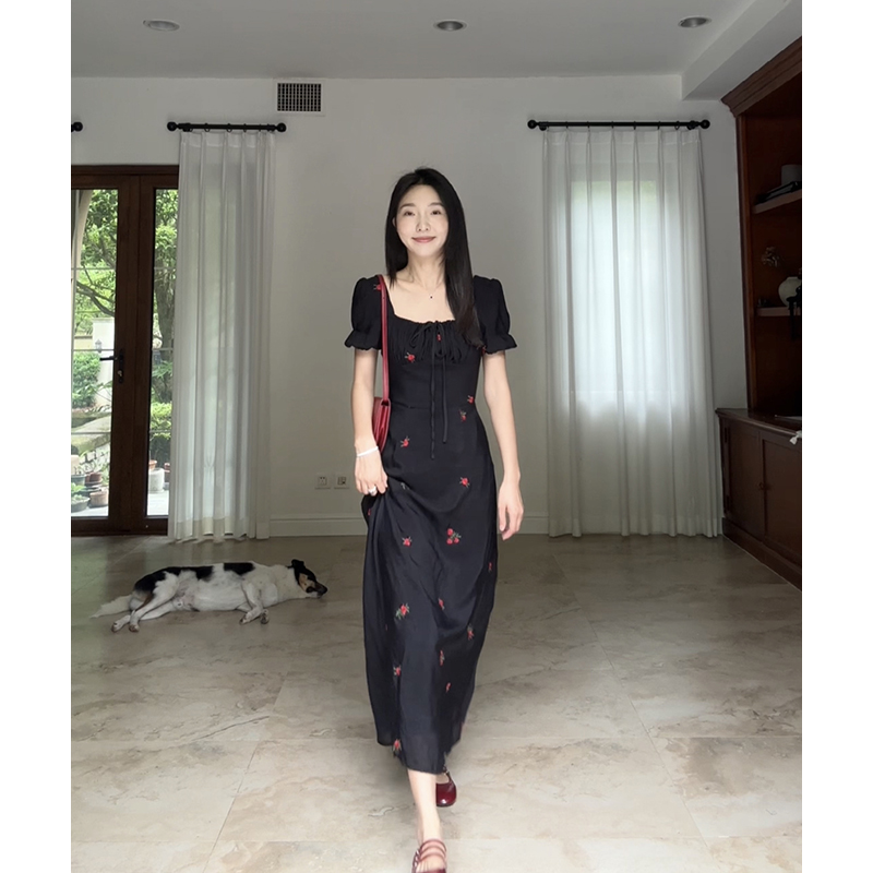 甜美碎花刺绣抽绳方领连衣裙夏季 现货不补单 长裙 清仓秒发