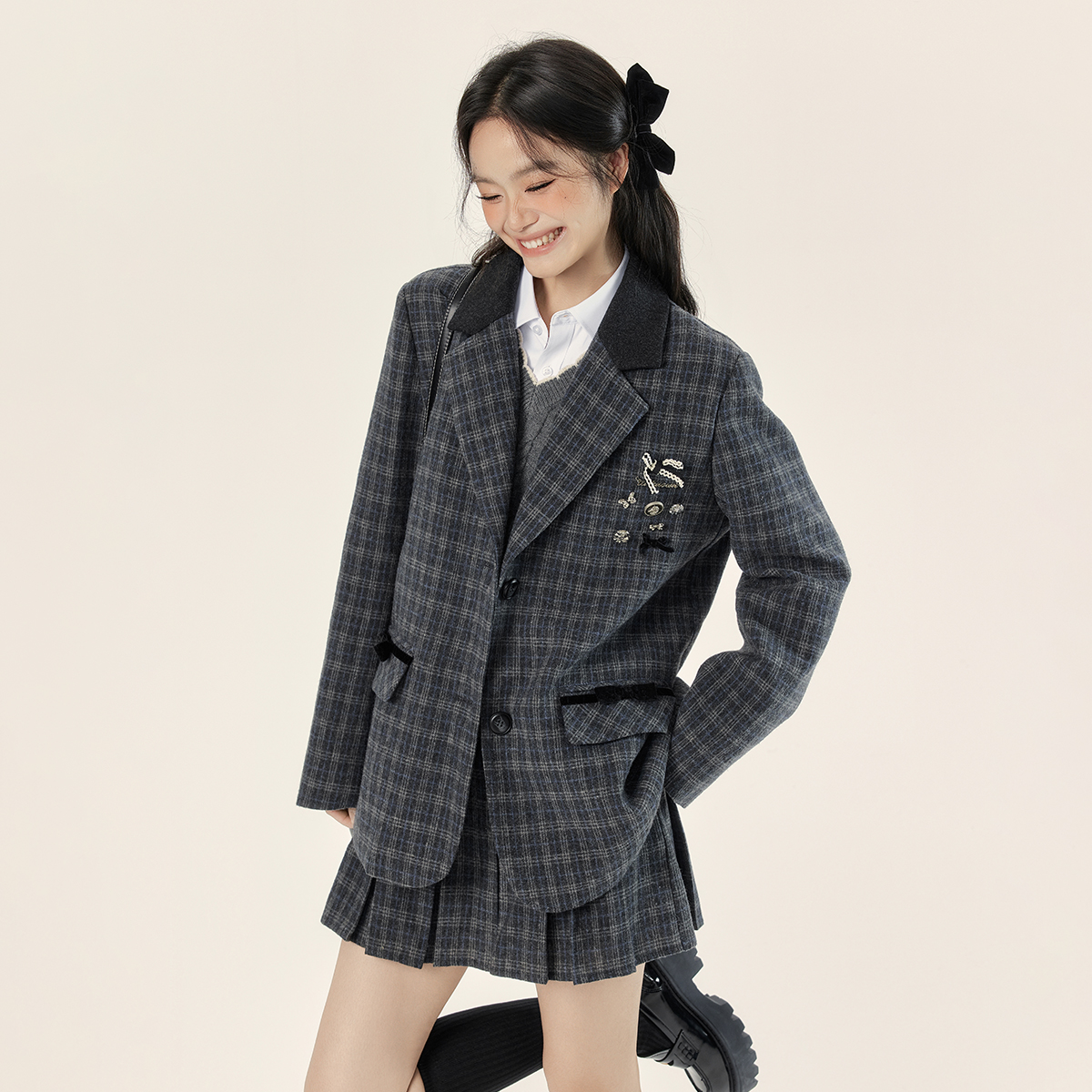 复古西装 EPTISON时尚 新款 女2025冬季 外套百褶短裙格纹两件套 套装