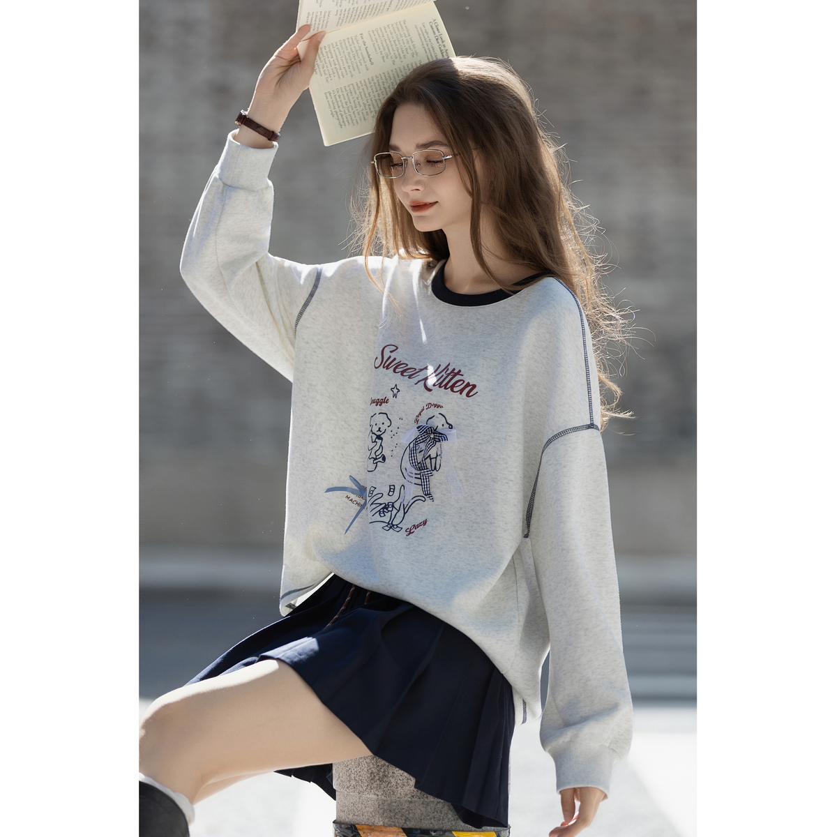 唐狮2025春秋季 卫衣女圆领卡通印花明线设计宽松慵懒风设计时尚