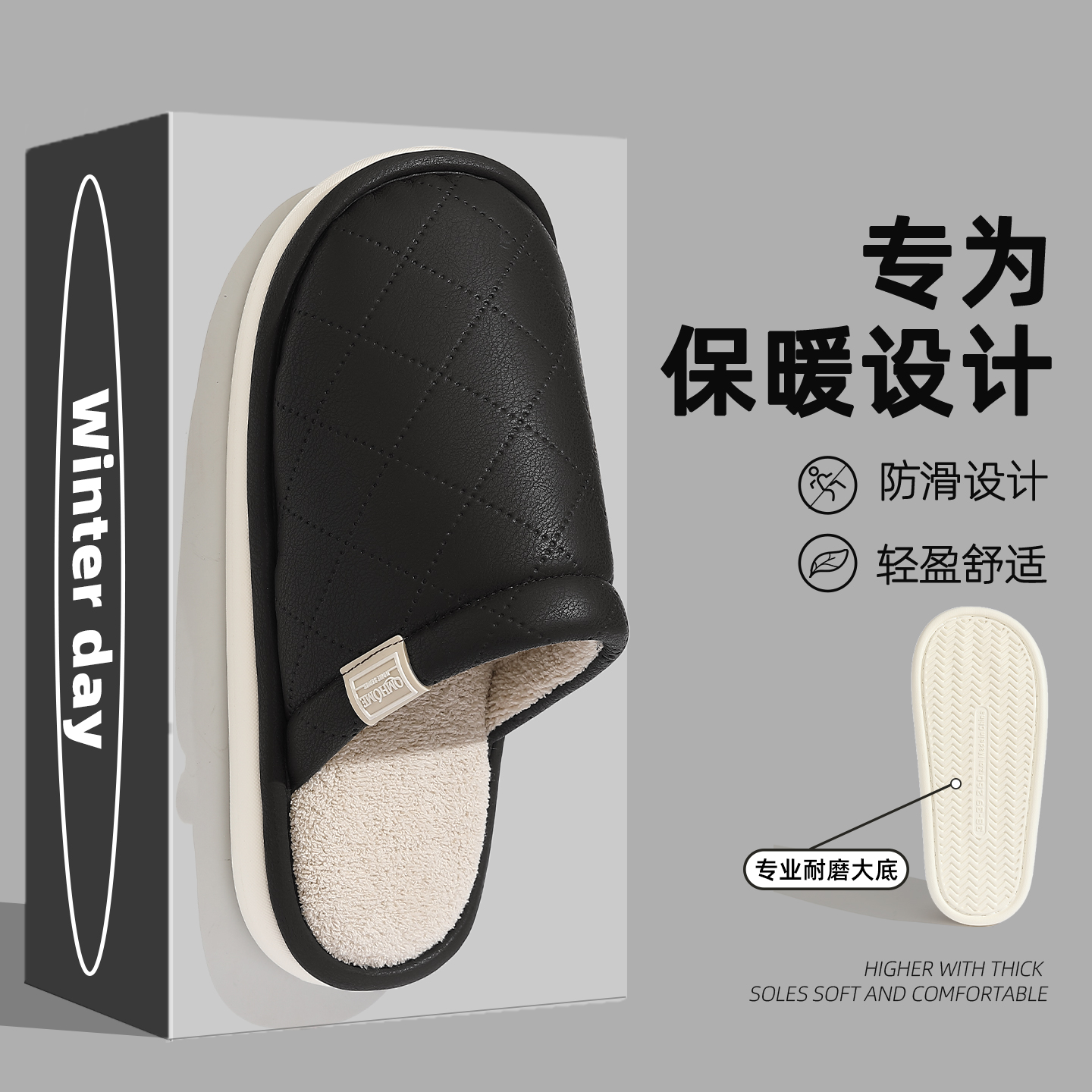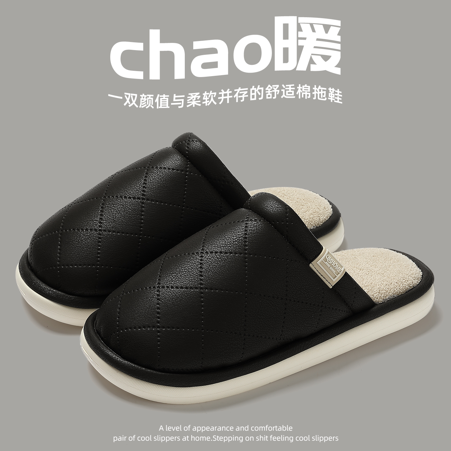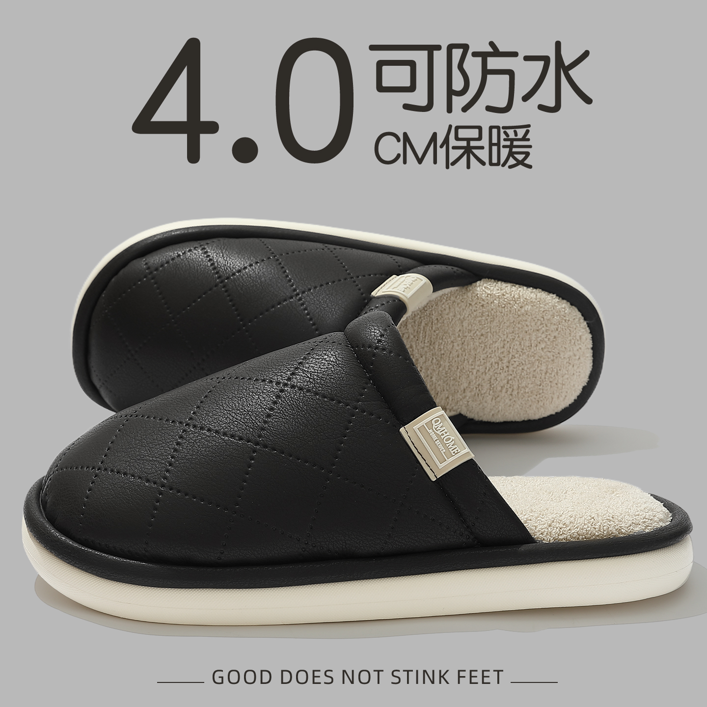 家居室内保暖防滑防臭毛绒棉鞋 PU防水棉拖鞋 2025新款 秋冬季 女 男士