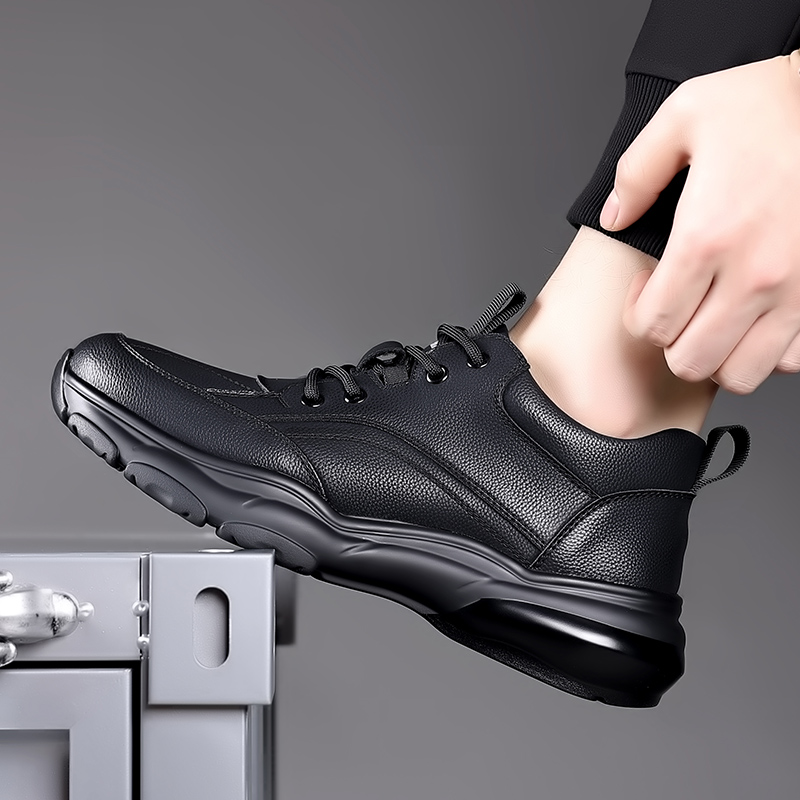 久站不累走路工作鞋 子 全黑色上班干活软底厚底软皮面运动休闲男鞋