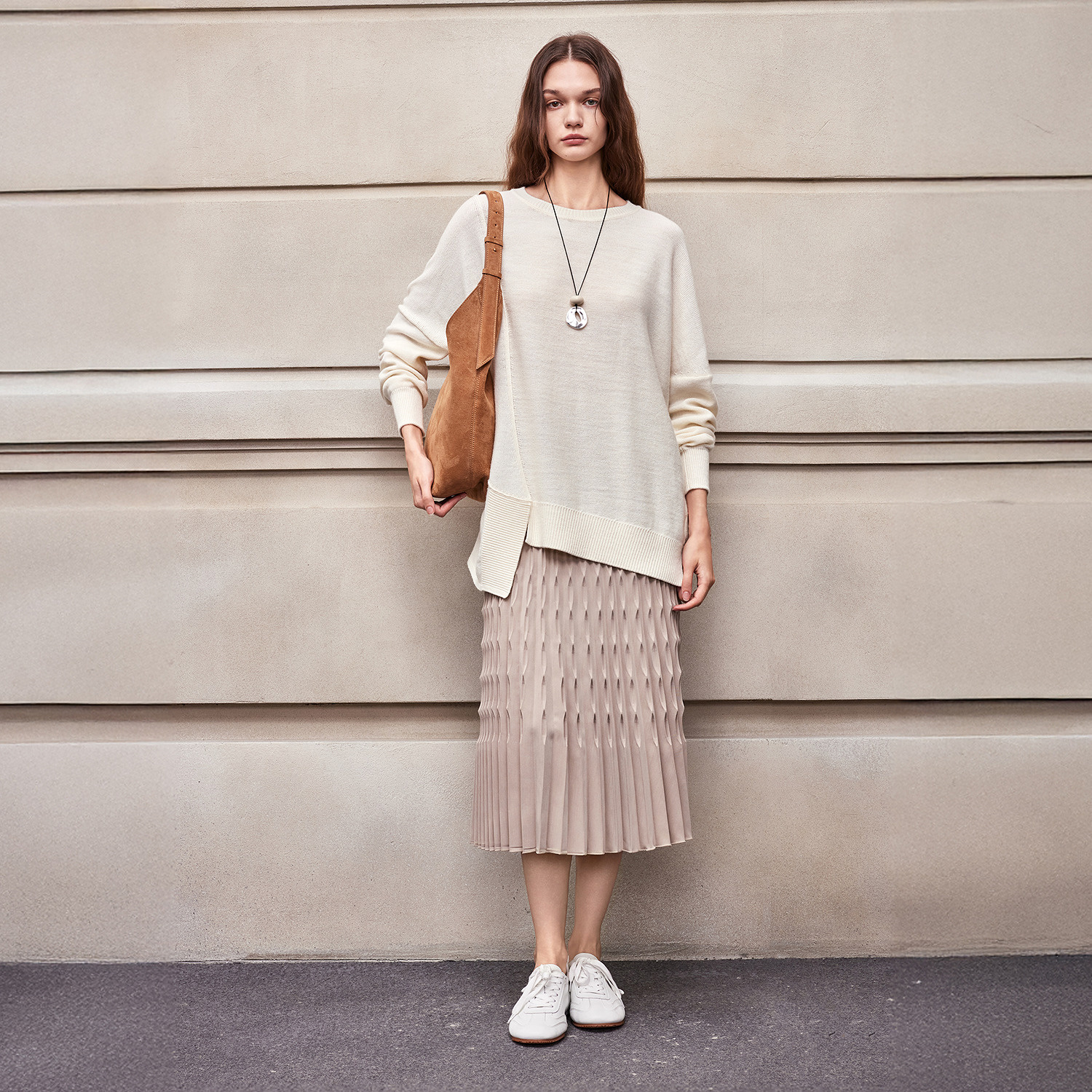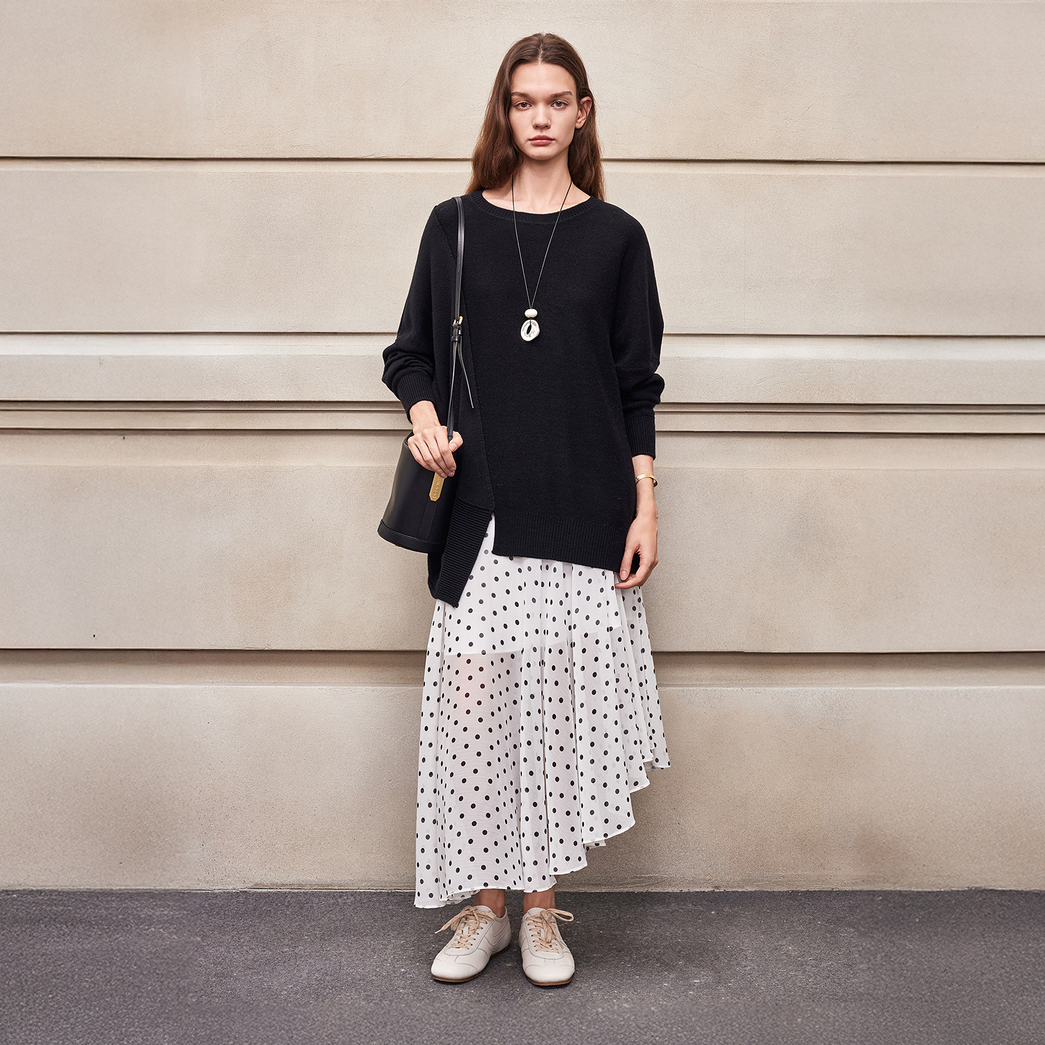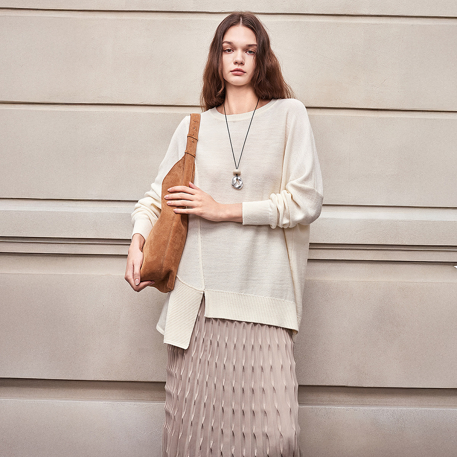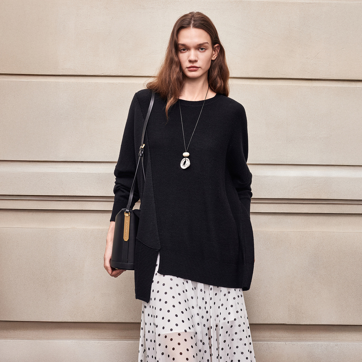 BCBG25早秋新款 女 简约百搭休闲不规则下摆落肩圆领套头针织衫
