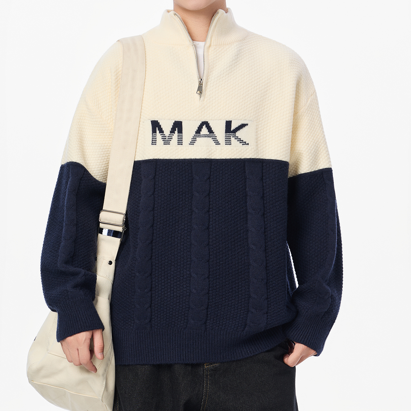 JHYQ美式 复古铆钉拼印花半拉链连帽毛衣外套男秋冬宽松针织卫衣衫