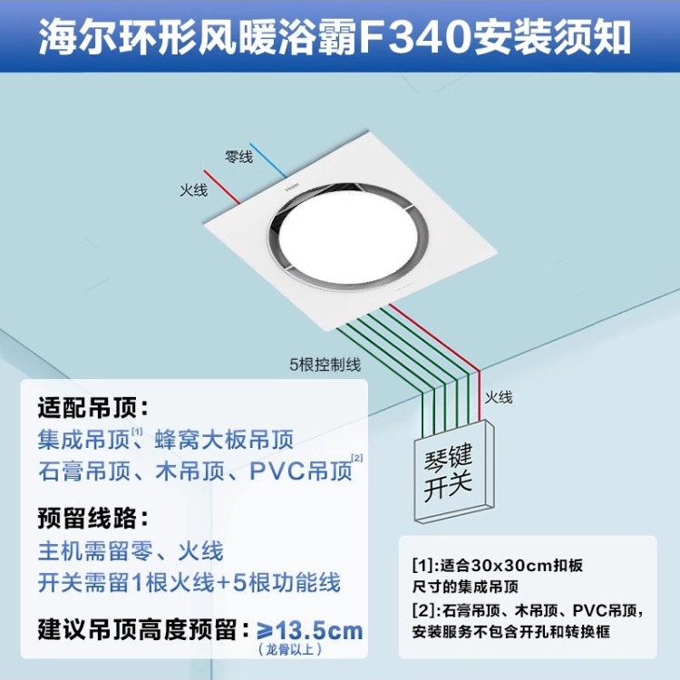海尔风暖浴霸正方形集成吊顶嵌入式 石膏吊顶卫生间取暖照明换气扇