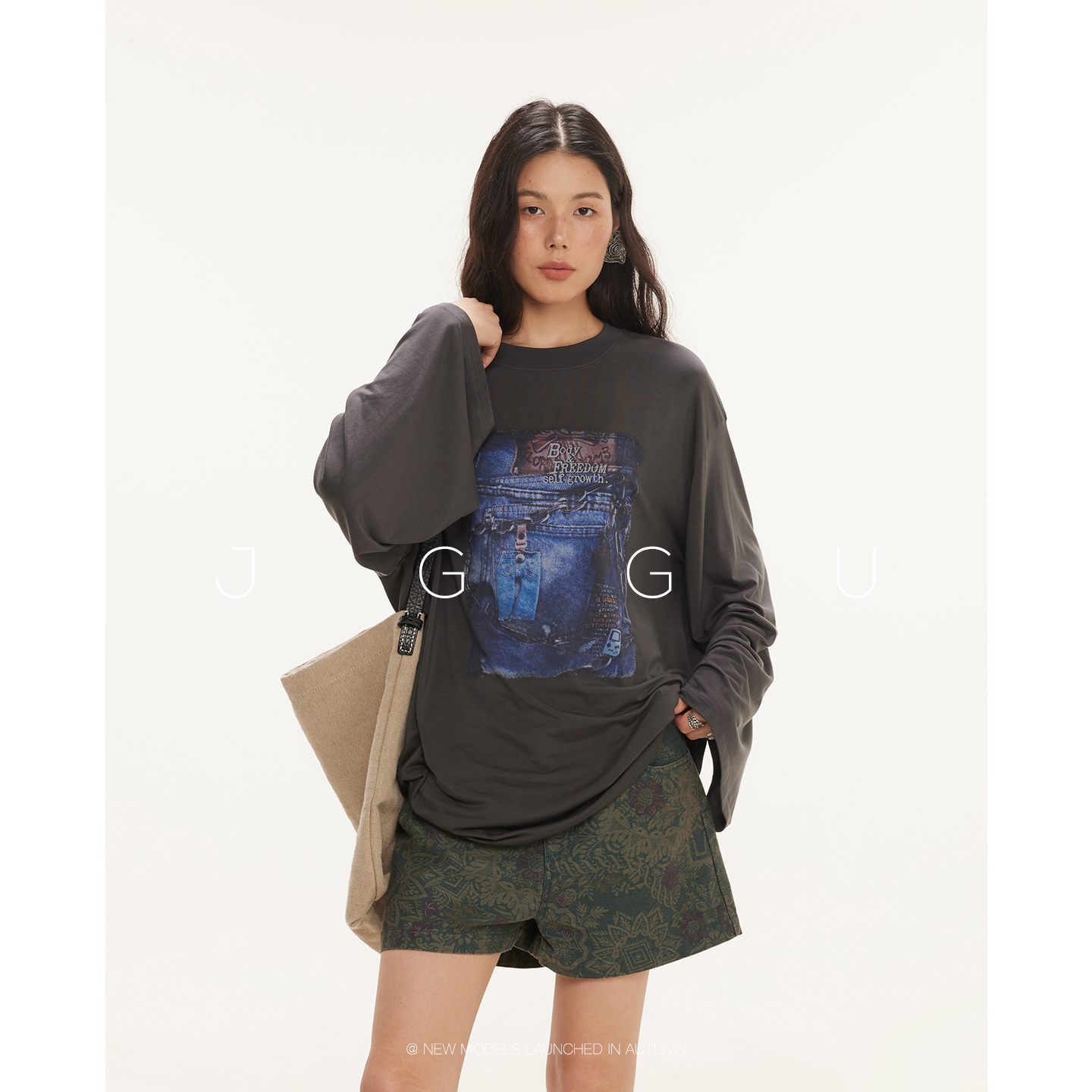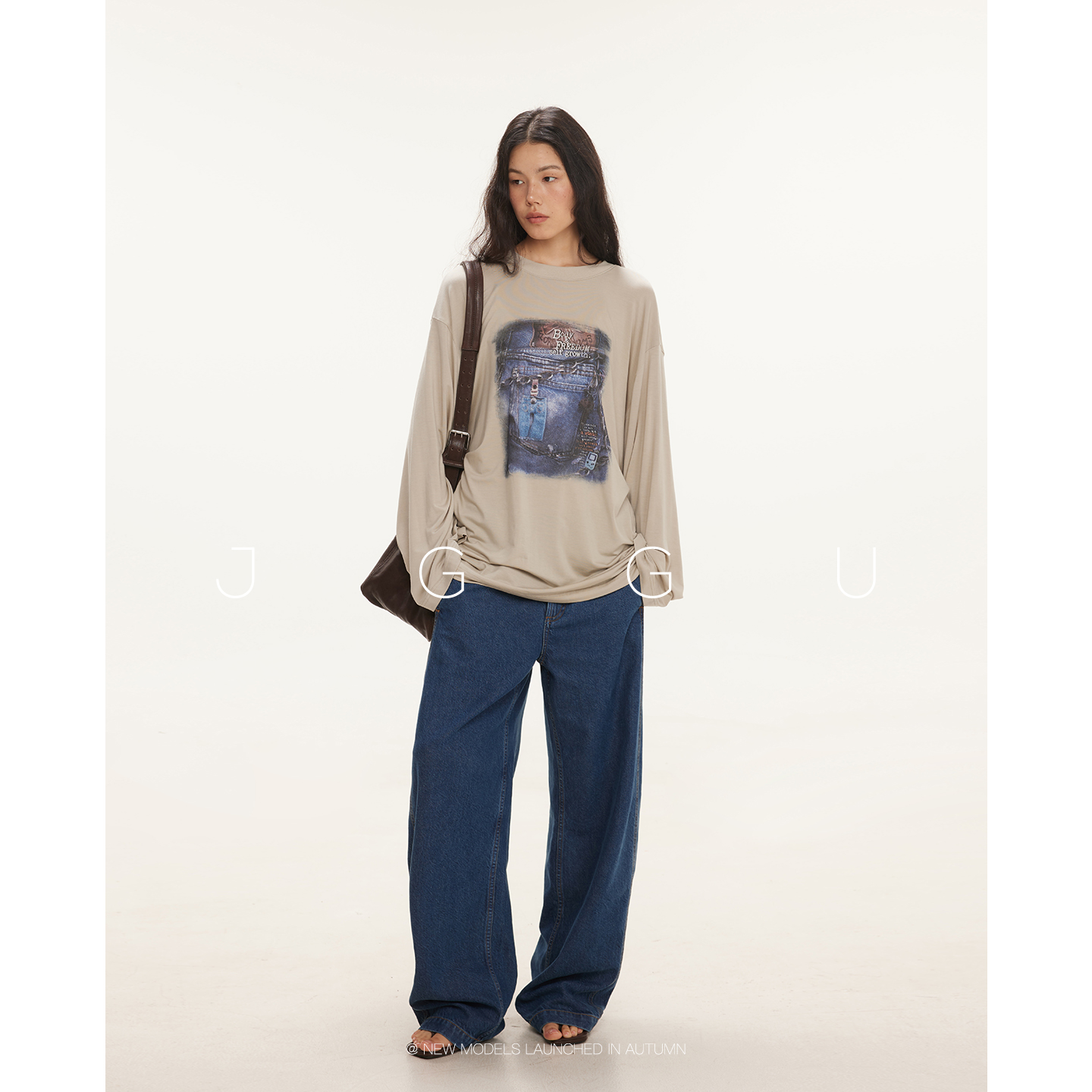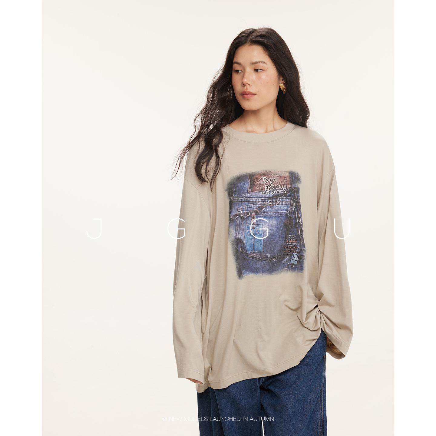 T恤女秋季 晶咕黑标JGGU 印花长袖 莱赛尔混纺美式 上衣 丹宁旧梦