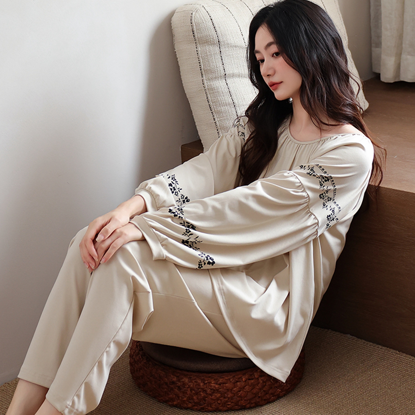 薄款 套装 圆领全棉家居服 长裤 女士带胸垫睡衣春秋简约宽松纯棉长袖