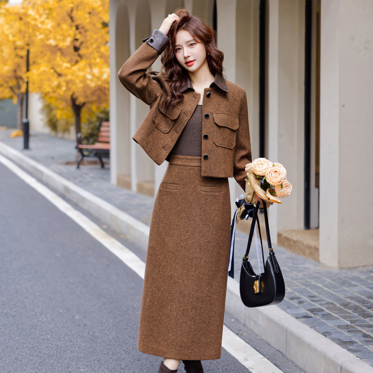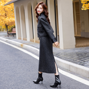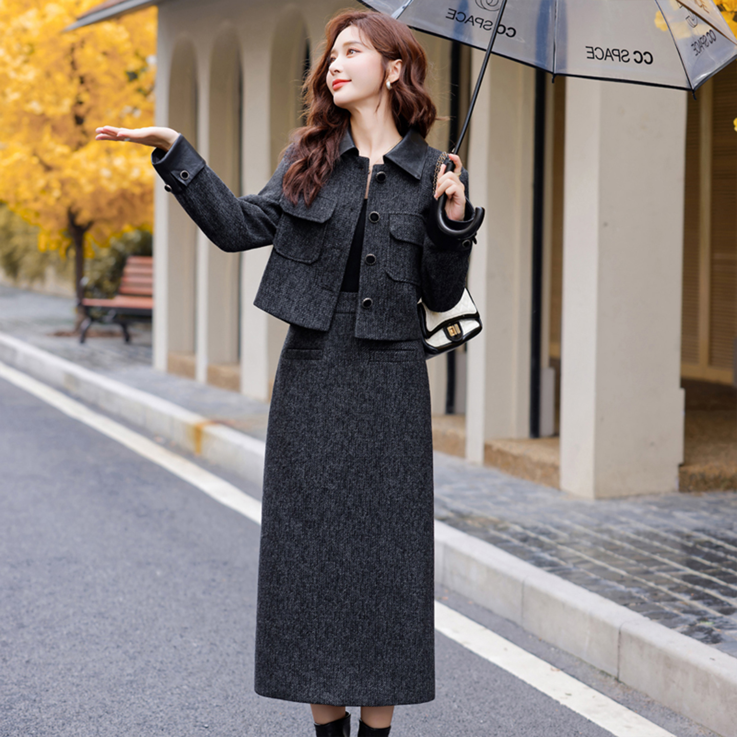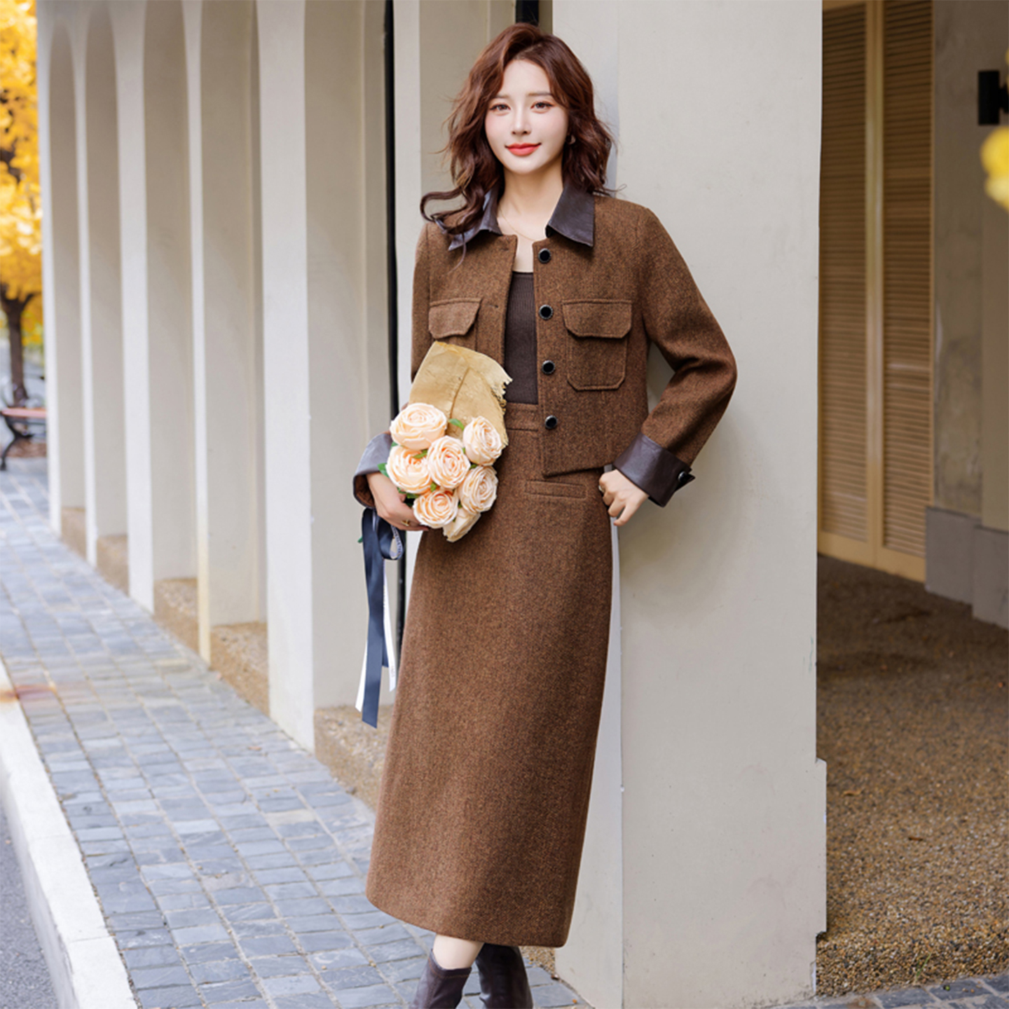 洋气外套半身裙修身 新款 两件套 女2025秋季 复古pu皮翻领小香风套装