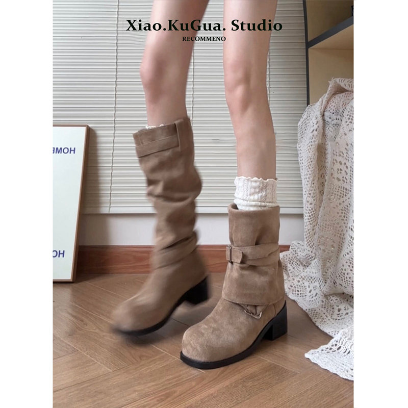 春秋西部靴靴子高跟薄款 褶皱堆堆靴女款 粗跟显瘦厚底长靴2025新款