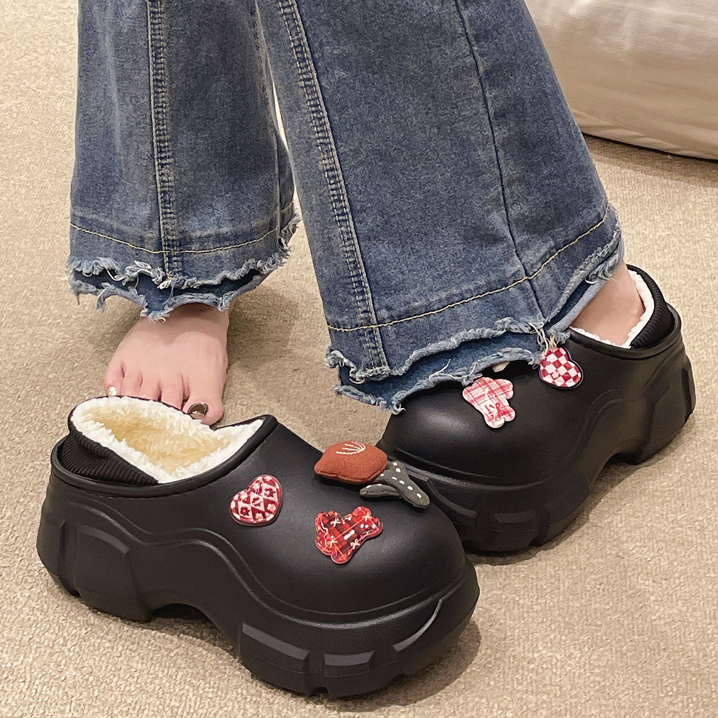 毛毛绒室内家居保暖鞋 厚底2025新款 子居家红色 女士秋冬季 棉拖鞋