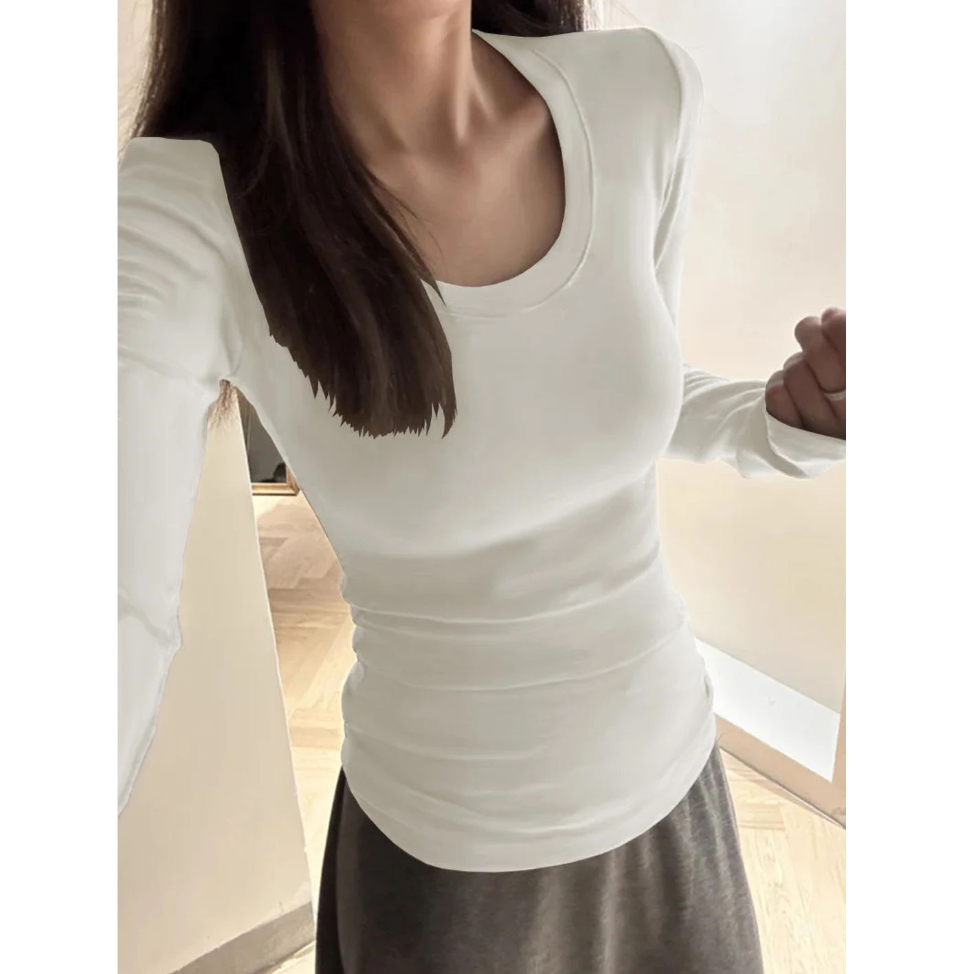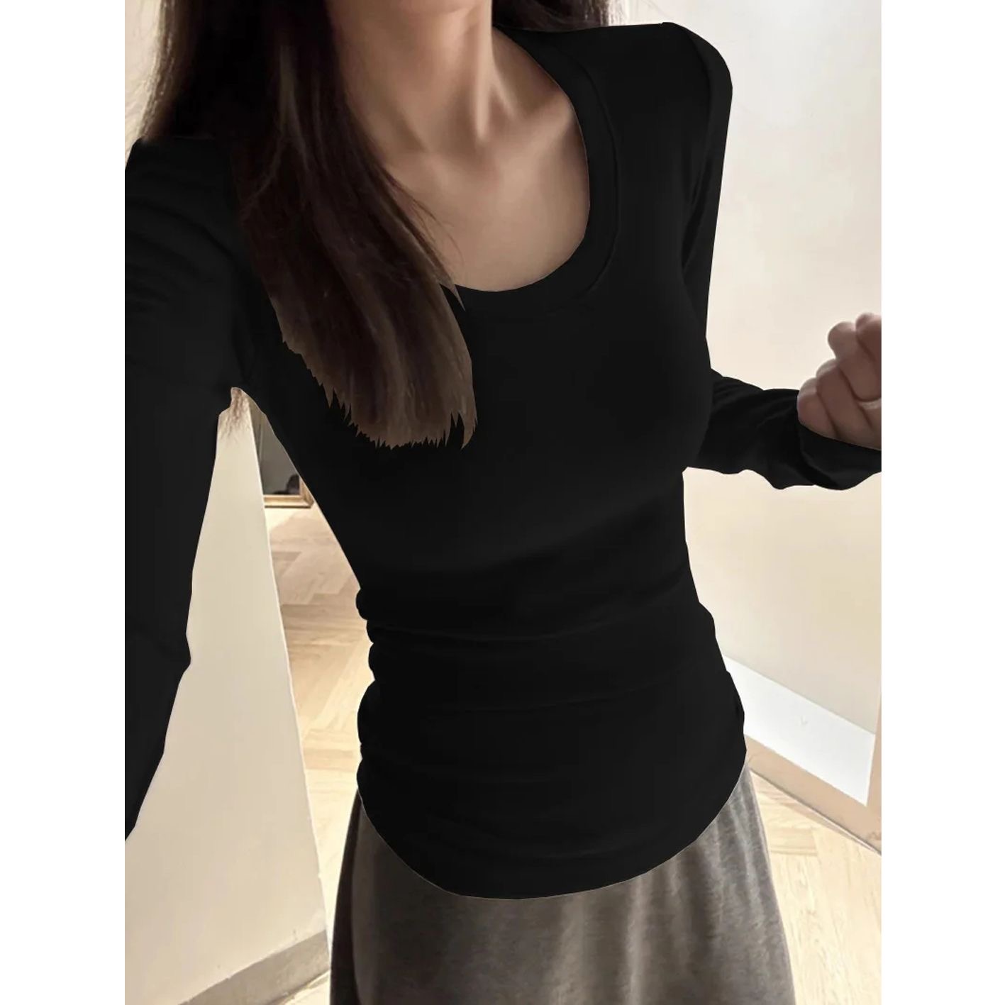 显瘦打底衫 正肩U领修身 上衣女 t恤女秋冬新款 德绒u领纯欲辣妹长袖