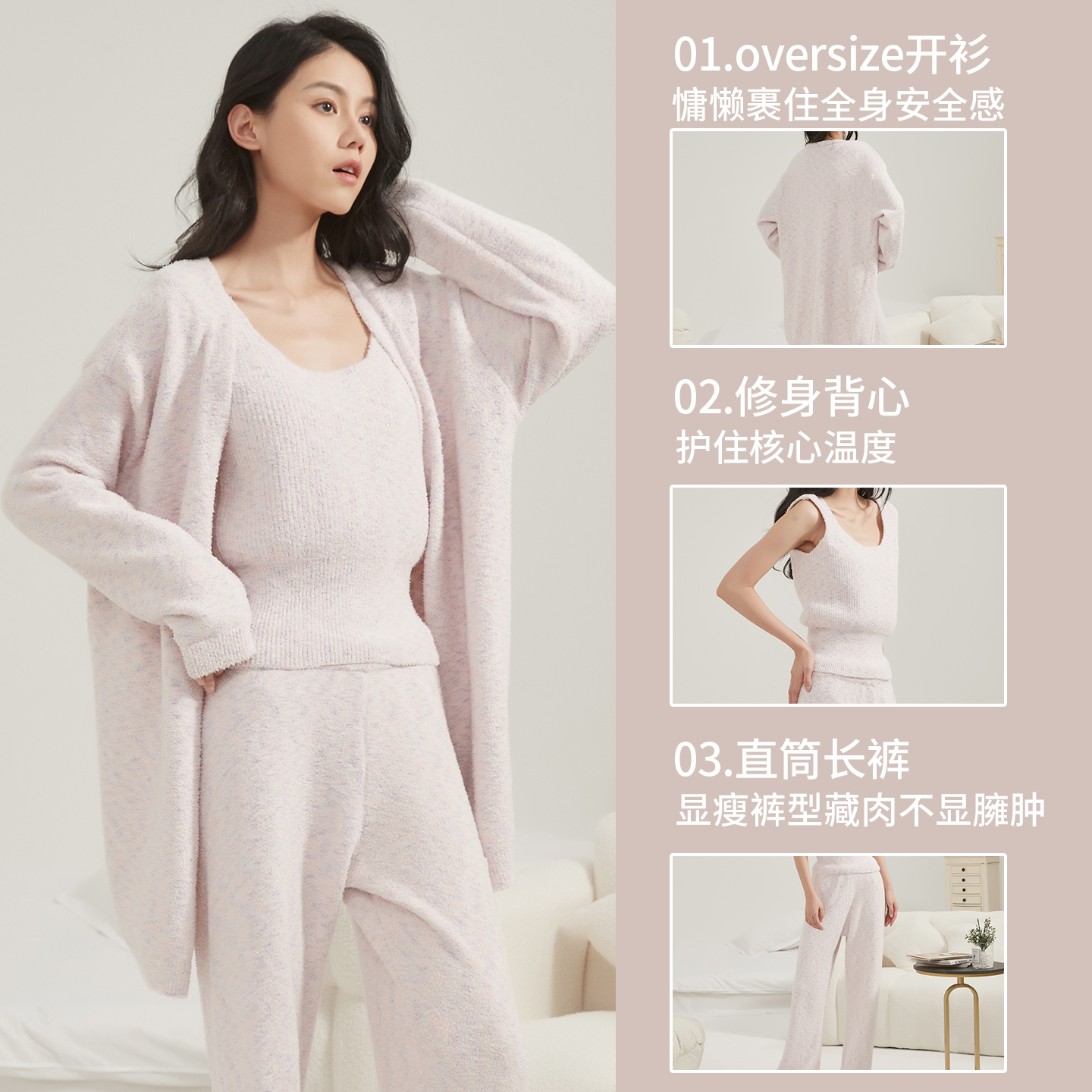 猫人半边绒睡衣女三件套冬季 保暖加绒加厚珊瑚绒奶fufu家居服套装