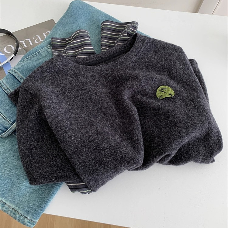 敲可爱小绿怪刺绣磨毛长袖 T恤女条纹假两件圆领深灰色打底25秋冬