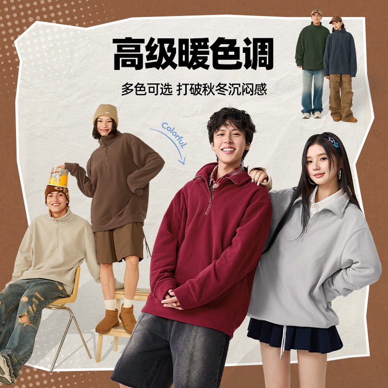新款 2025秋季 暇步士男装 休闲保暖半拉链立领卫衣男 舒适混色绒