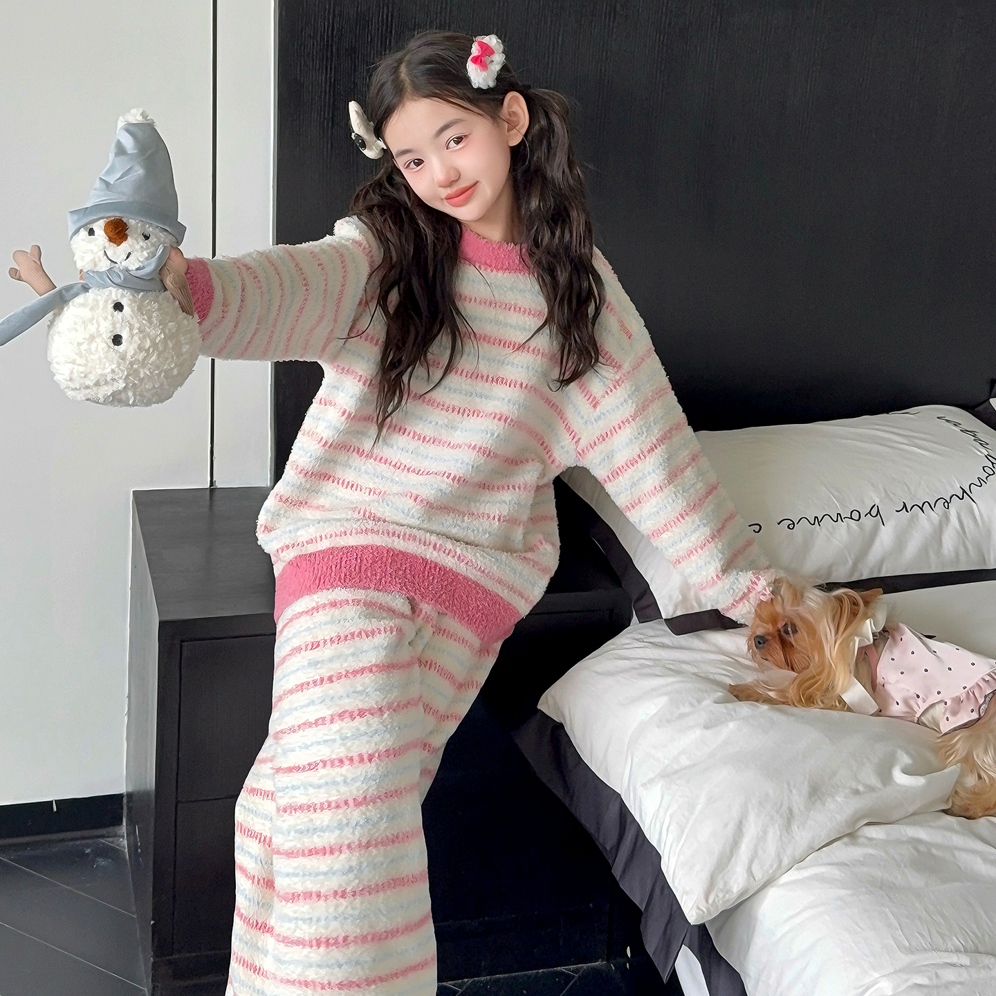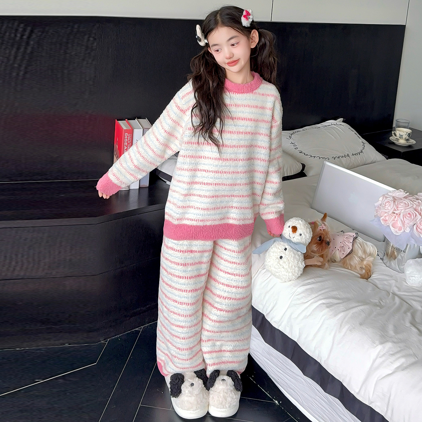 儿童半边绒家居服初中生女孩加厚珊瑚绒套装 女童睡衣冬季 2025新款