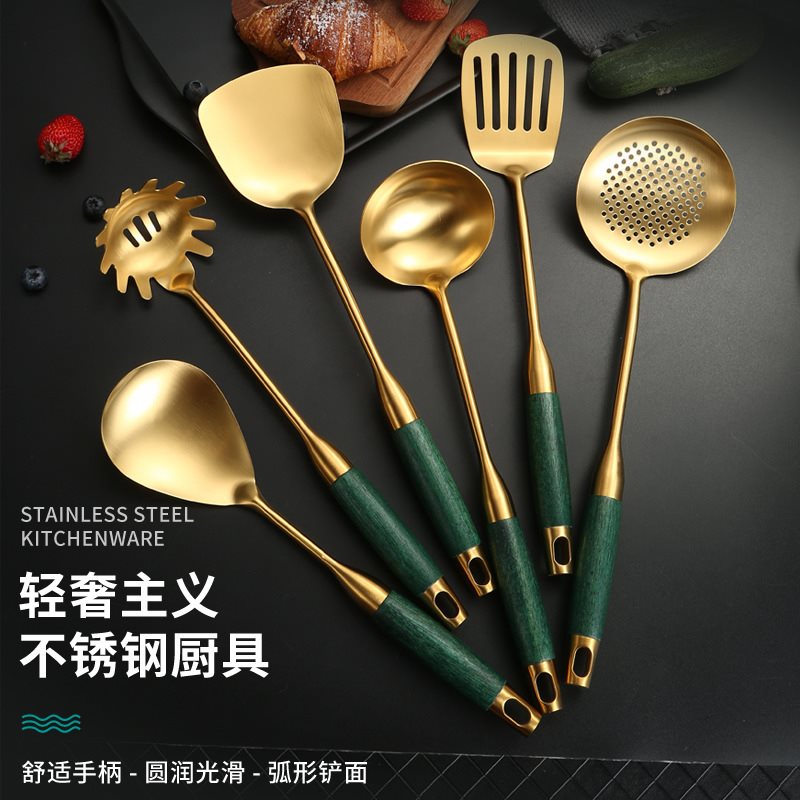 轻奢防烫金色烹饪锅铲汤勺大漏面捞煎铲勺不锈钢木柄厨具多规格起