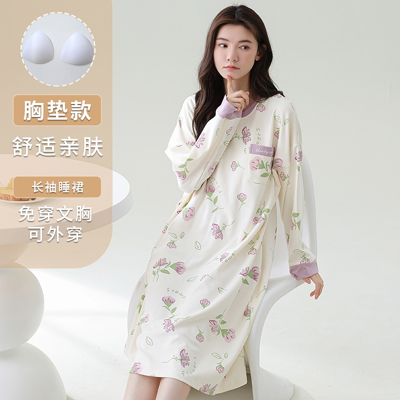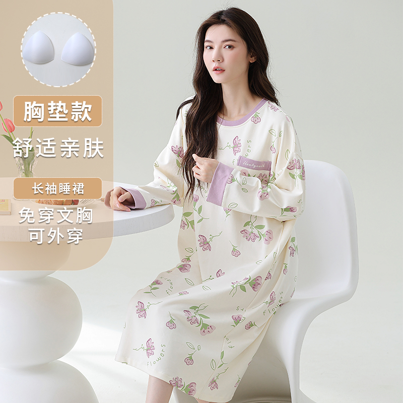 可外穿休闲大码 圆领套头中长款 睡衣裙 睡裙长袖 高级感带胸垫一体式