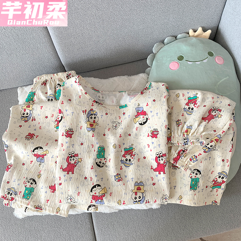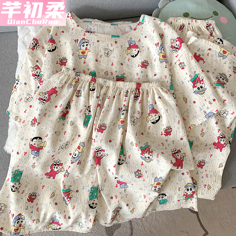 松弛感慵懒泡泡纱少女家居服套装 开衫 女春秋季 猫人云朵棉睡衣长袖