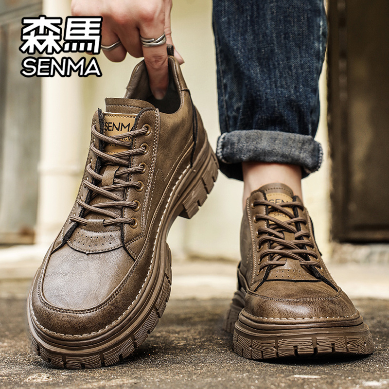 男士 英伦百搭休闲黑色板鞋 皮鞋 真皮软底中帮工装 森马男鞋 潮鞋 秋季