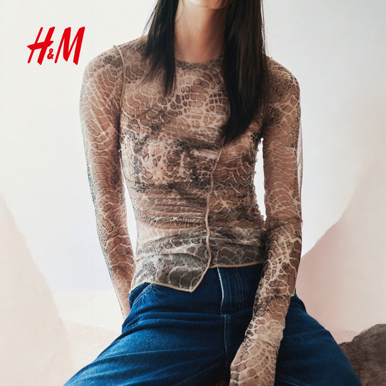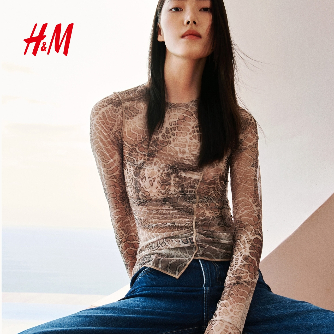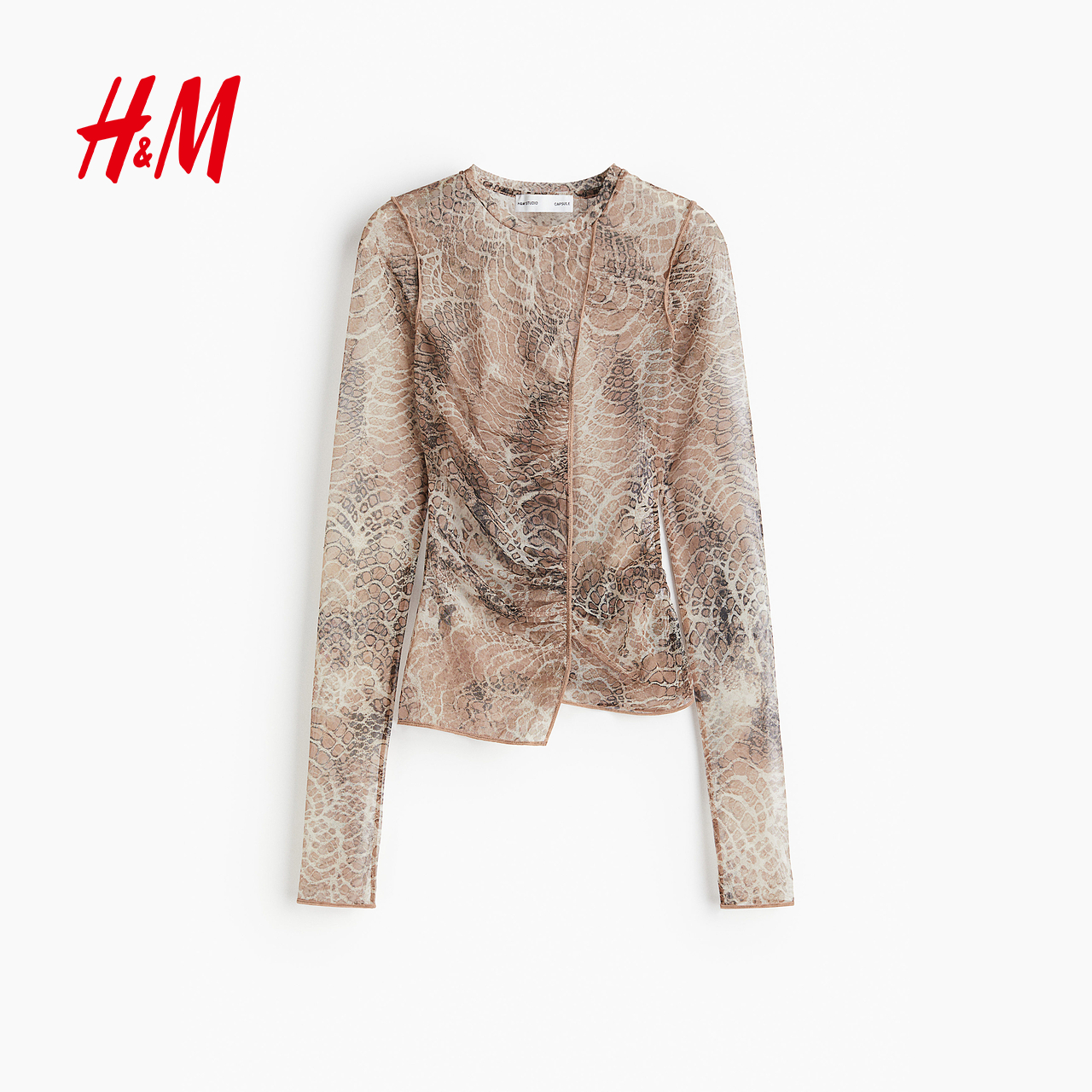 HM女士T恤2025秋季 垂褶网纱上衣1290853 新款