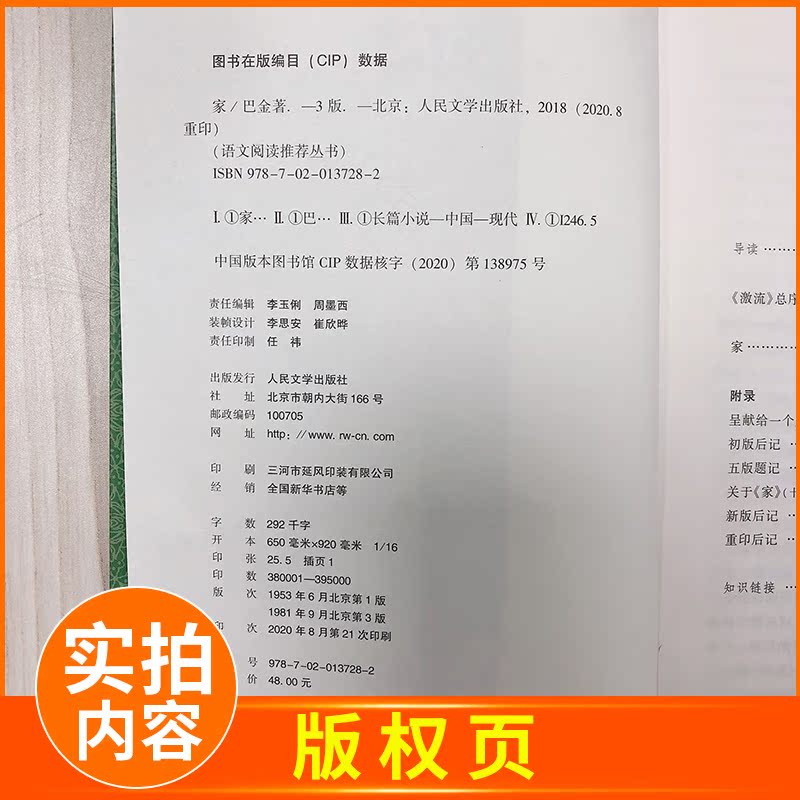中学生课外阅读推荐 家 巴金著 全新正版 书目 人民文学出版 名著口碑版 丛书 经典 社 本 初中生语文阅读推荐 根据语文教材编写