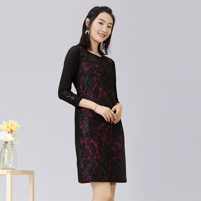 声雨竹专柜春夏款 圆领拼接大花亮片拉链蕾丝连衣裙 七分袖