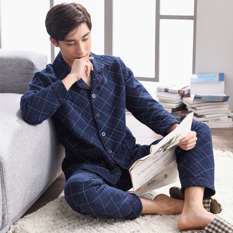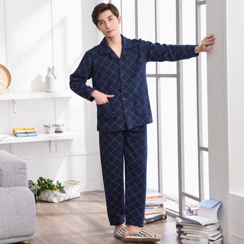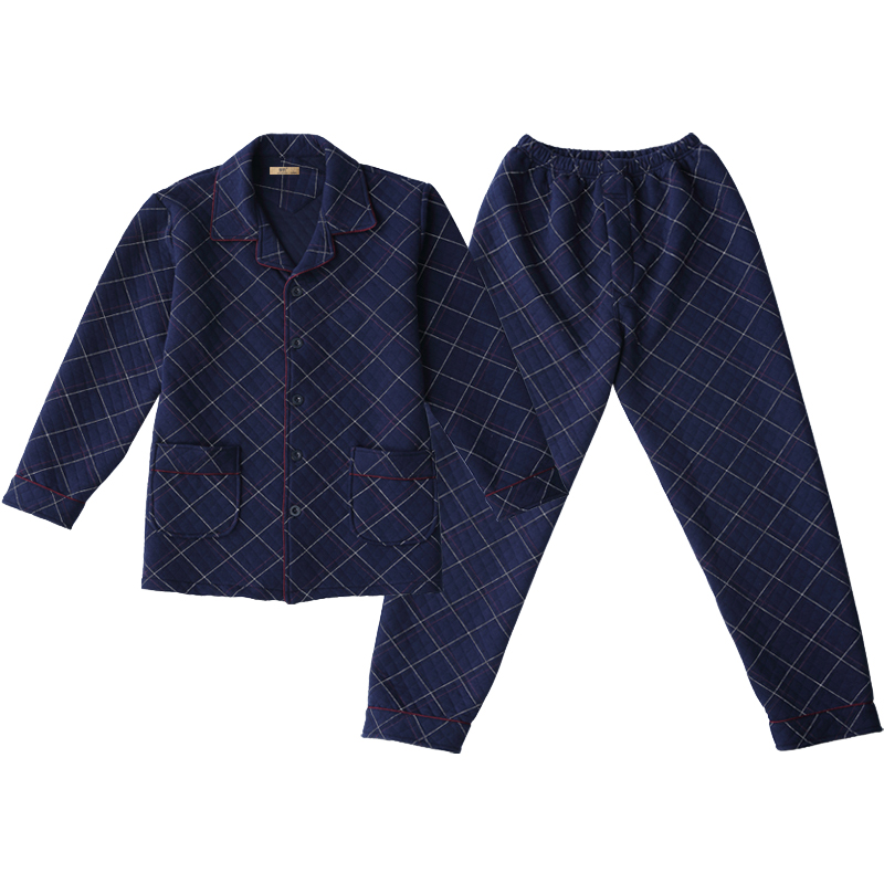 纯棉加厚格子可外穿空气棉三层夹棉保暖家居服套装 男士 睡衣秋冬季