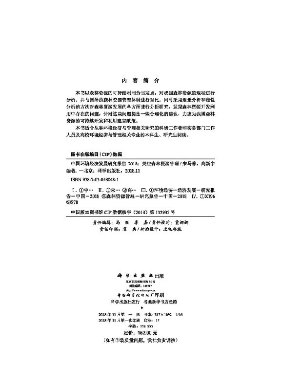 中国环境经济发展研究报告2018:关注森林资源管理科学出版 社