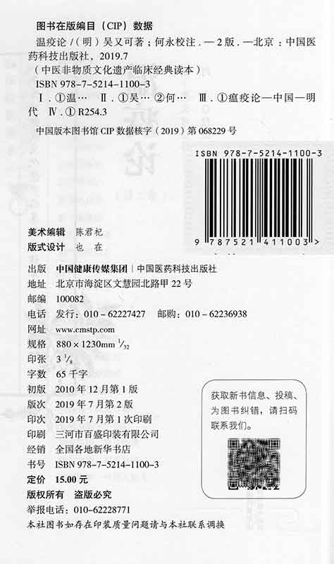 温疫论 第二版 著中国医药科技出版 中医非物质文化遗产临床经典 社 吴又可 读本第一辑 明 现货