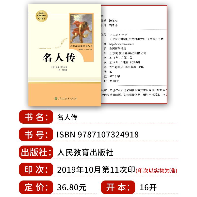 原著无删减完整版 正版 罗曼罗兰八年级下册必读课外书阅读人教版 初中学生读物书籍经典 社 世界名著小说人民教育出版 名人传
