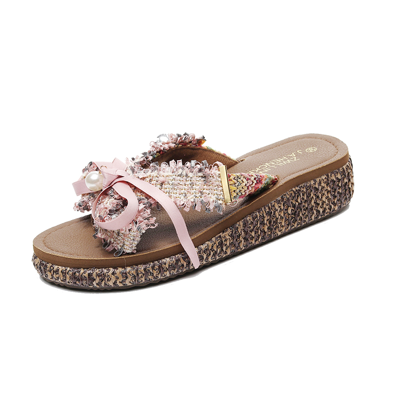 潮 中跟蝴蝶结沙滩鞋 韩版 海边人字拖女夏坡跟厚底防滑夹脚凉拖时尚