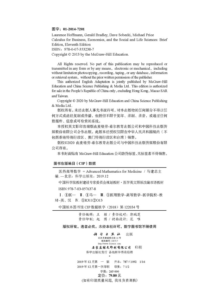 改编双语教材科学出版 供来华留学生医学类专业双语及全英语教学使用医学英文原版 社 医药高等数学英文改编版 现货
