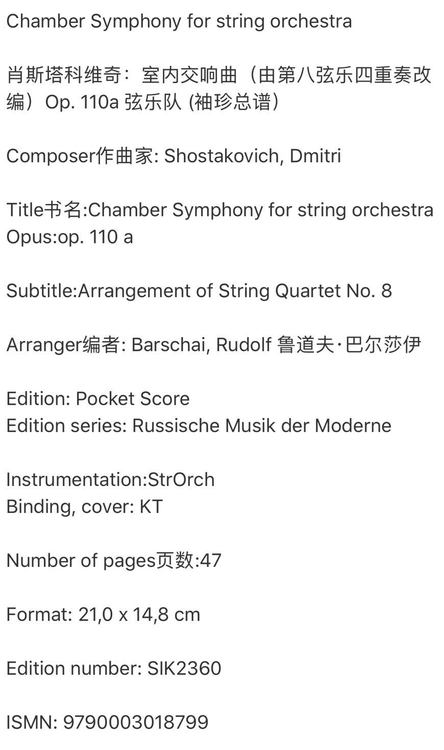 String SIK2360 Op110a 非演奏用谱 思考斯基乐谱 研习小总谱 NO8 改编乐队 Quartet 肖斯塔科维奇 Schostakowitsch 弦乐四重奏