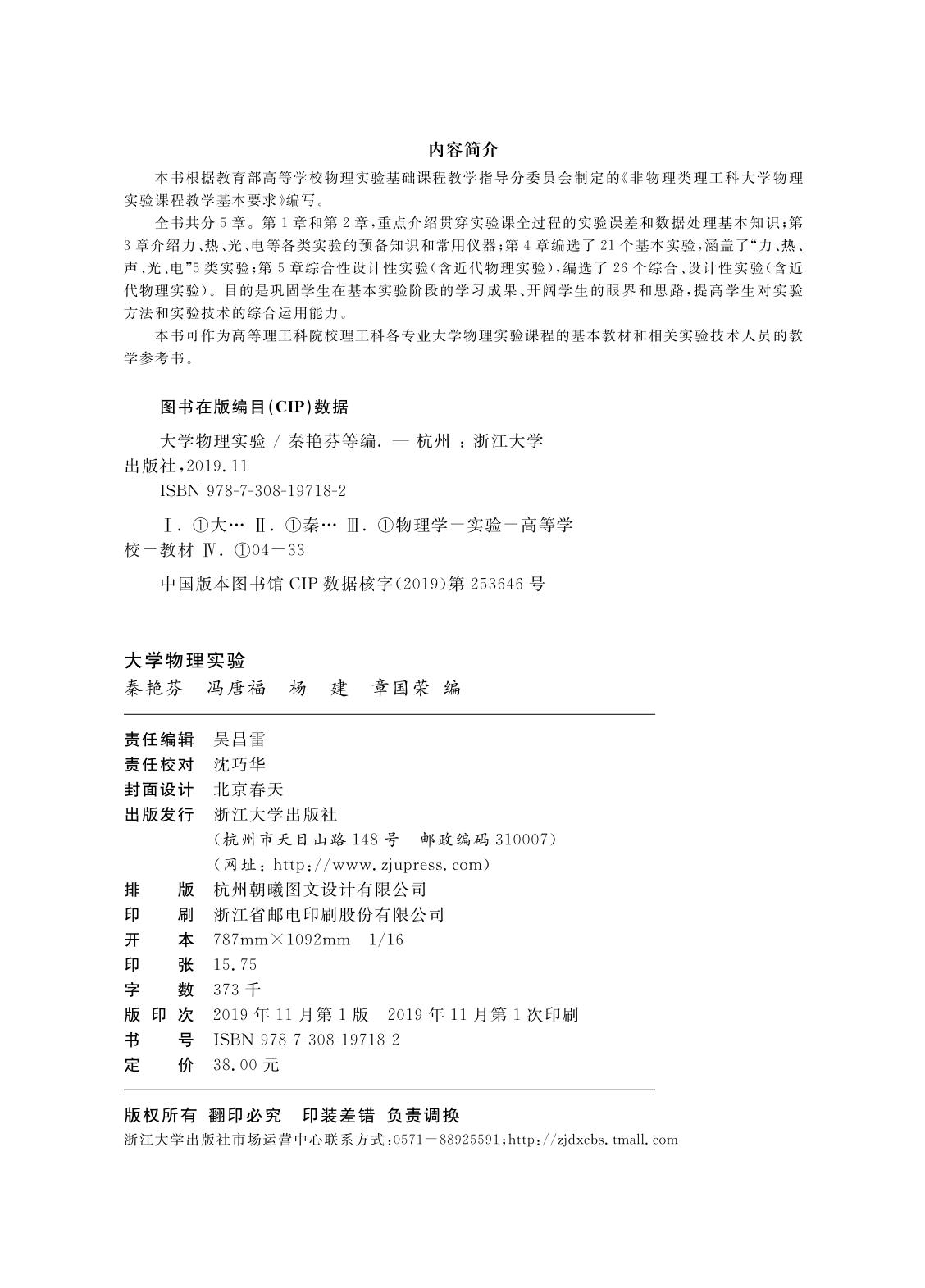 冯唐福 秦艳芬 杨建 章国荣 社 大学物理实验 浙江大学出版 浙江省普通高校十三五新形态教材