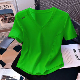 露锁骨正肩短款 欧货弧形下摆V领短袖 修身 新款 上衣 T恤女2025夏季