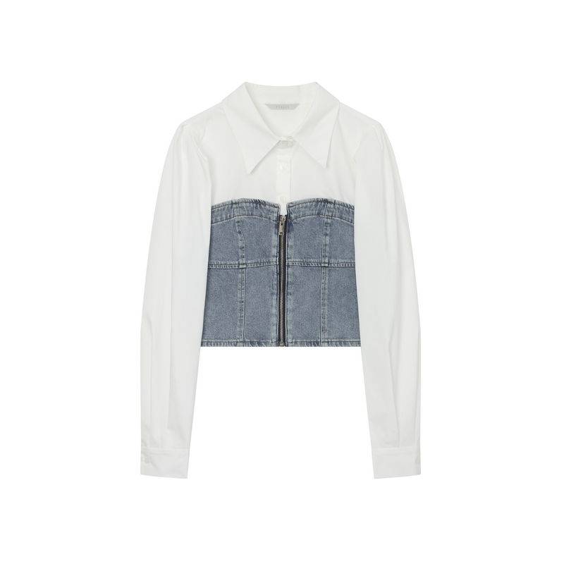 设计感POLO领长袖 飘蕾拼接牛仔衬衫 甜美时尚 新款 衬衣 女秋季