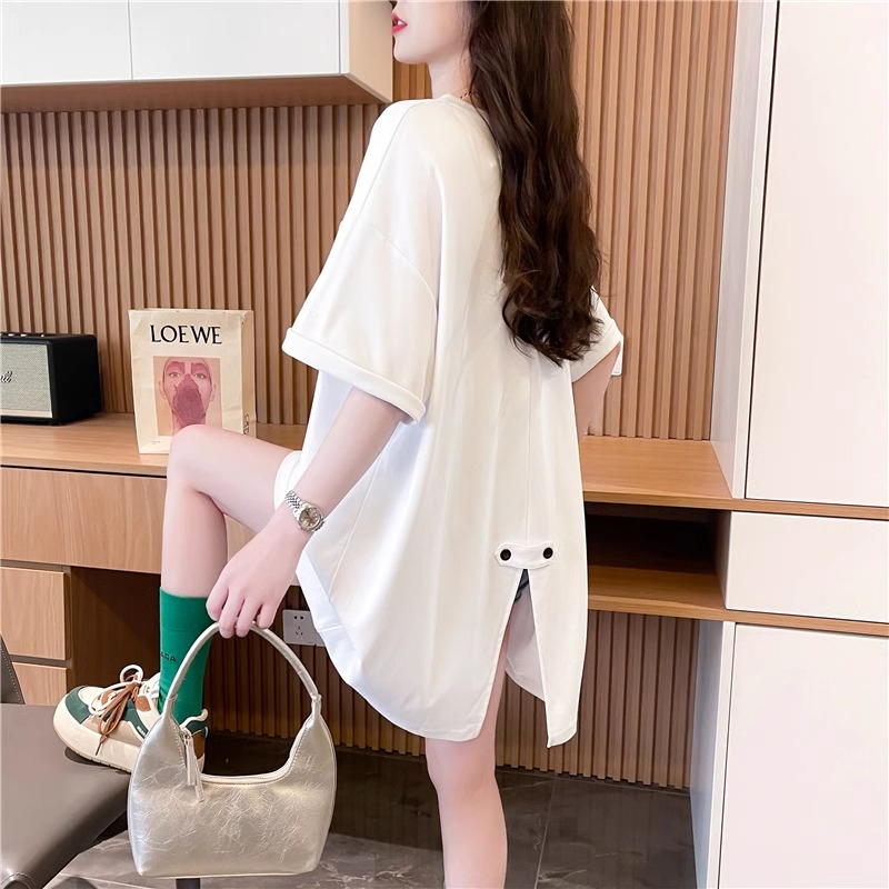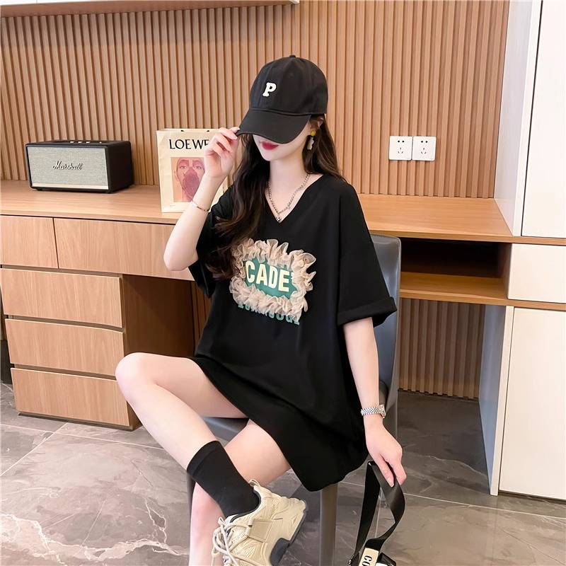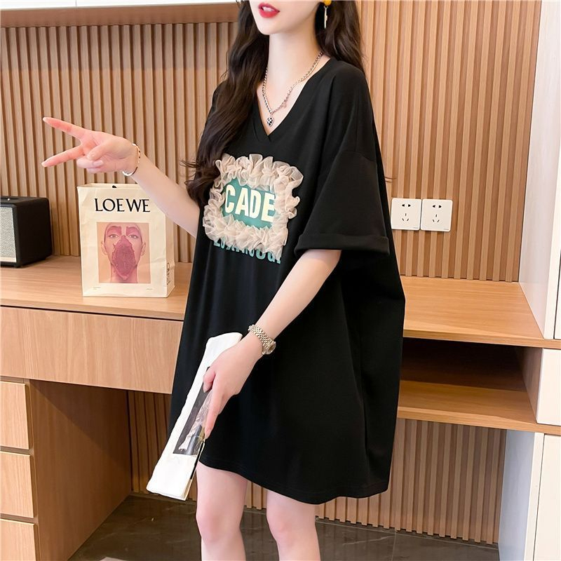 胖mm设计感V领短袖 宽松百搭洋气中长款 T恤女夏季 韩版 上衣 新款 大码