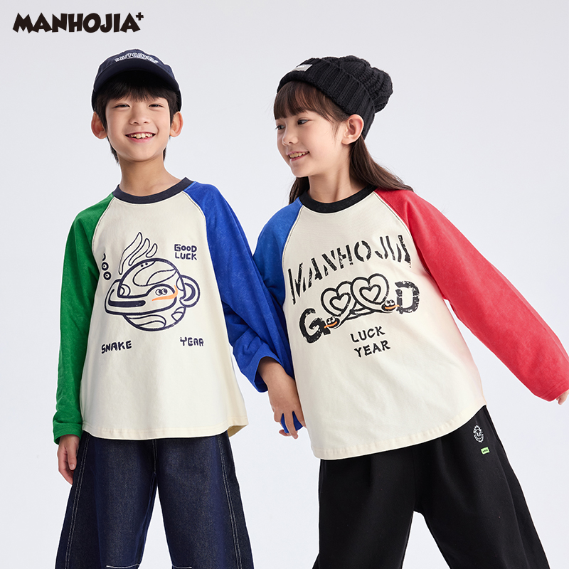 T恤 儿童T恤撞色插肩宽松福气蛇纯棉蛇年长袖 漫画家 sorona凉感