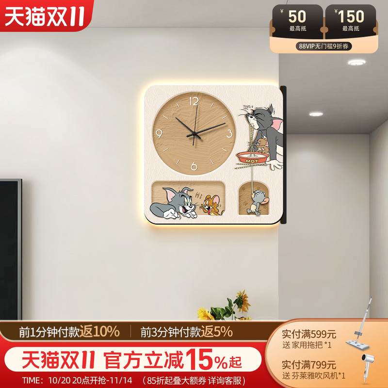 猫和老鼠客厅拐角挂钟奶油风转角双面钟创意时钟壁灯家用静音钟表
