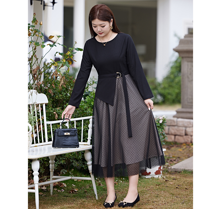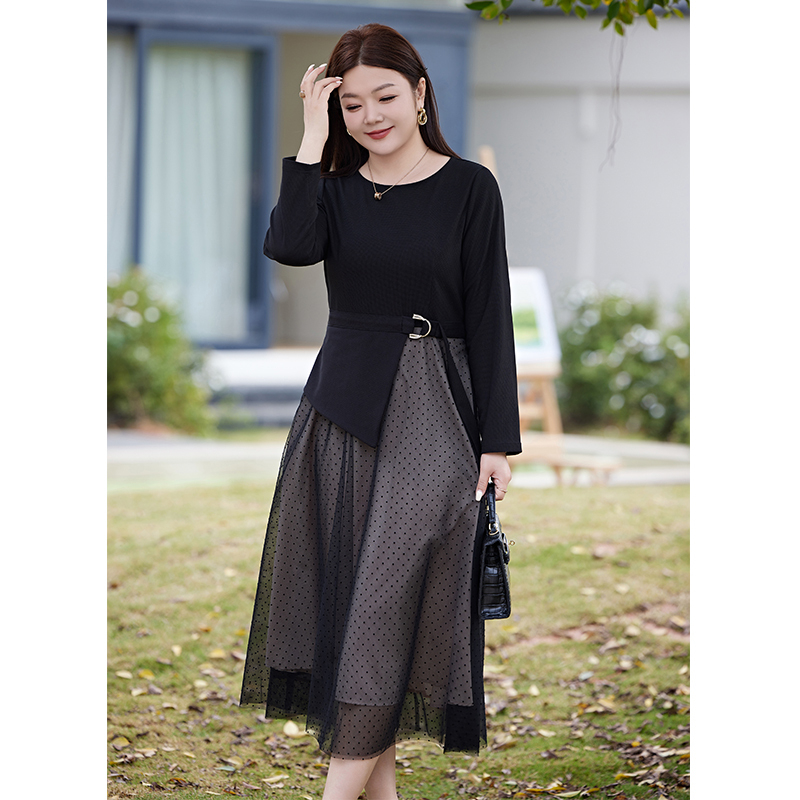 连衣裙长袖 2025秋装 女装 大码 显瘦胖MM网纱拼接针织气质小黑裙 新款
