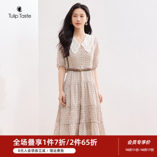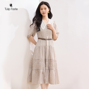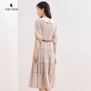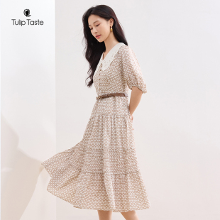 郁香菲印花雪纺连衣裙女气质优雅夏季 绣花翻领收腰拼接A字裙 时尚