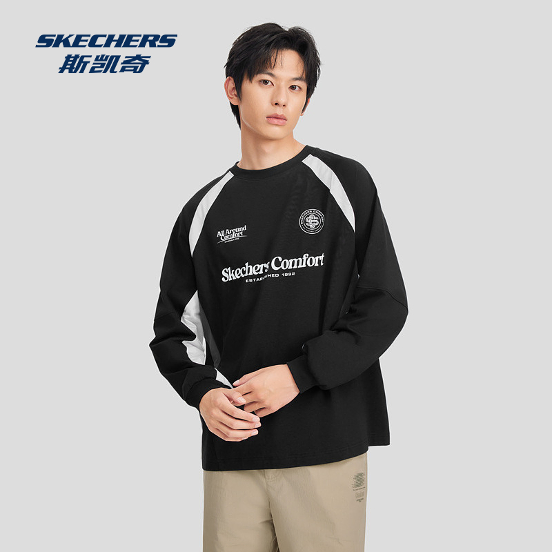 型秋冬季 宽大版 运动休闲撞色 T恤衫 斯凯奇官方outlets成人针织长袖