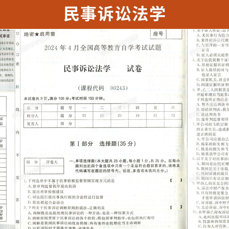 00243民事诉讼法学自学考试教材自考通历年真题试卷自考一考通题库2025年法学专业成人自考成考高升专中专升大专高起专复习资料