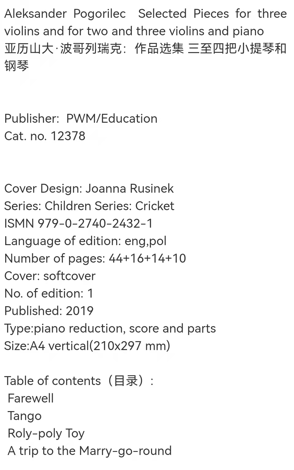 乐谱书 Pieces 作品选集 波兰pwm原版 and PWM12378 波哥列瑞克 Violins Pogorilec 三至四把小提琴和钢琴 for Selected Piano