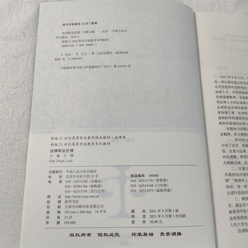 编 中国人民大学出版 培养目标和要求 高等职业教育教材·法律类 考试复习资料 专门人才 王琳 9787300296807 法律职业伦理 社