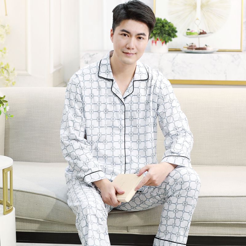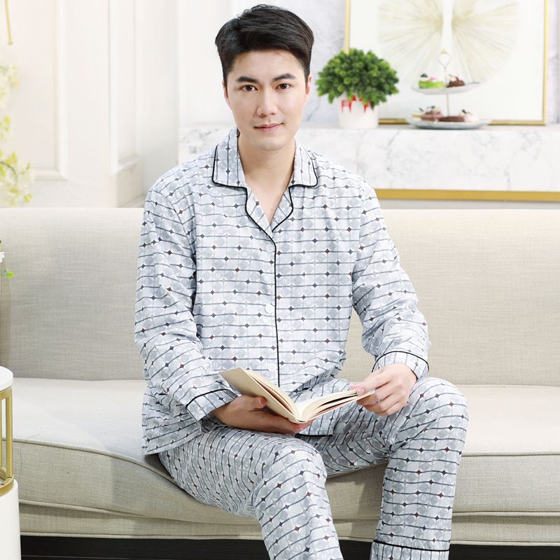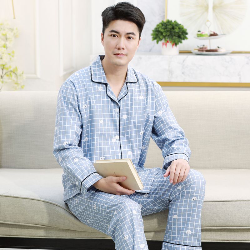 青中老年家居服套装 全棉睡衣男士 梭织纯棉格子夏天长袖 薄款 春秋季