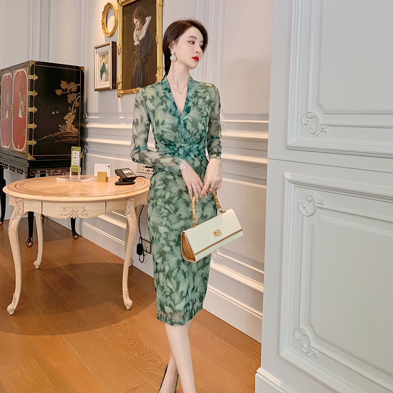 气质v领系带修身 新款 显瘦包臀裙内搭 绿色连衣裙2025秋季 网纱长袖