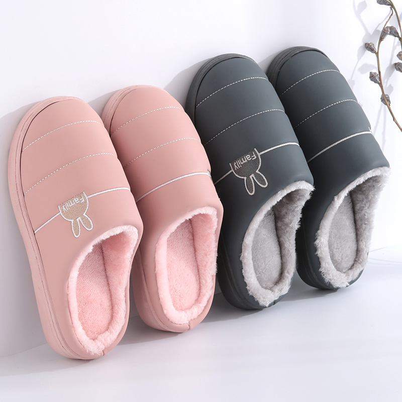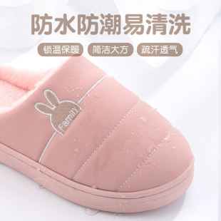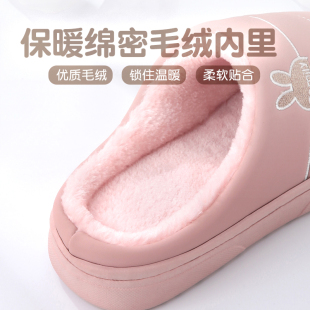 女 厚底防滑室内防水PU保暖毛绒月子透气家居拖鞋 情侣棉拖鞋 秋冬季