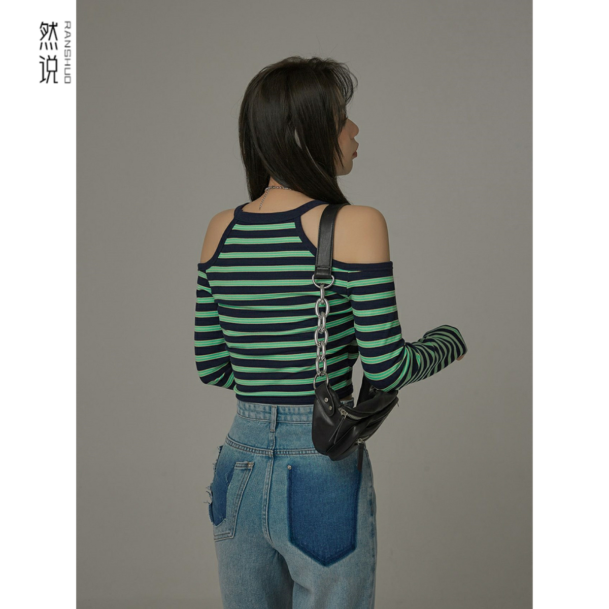 女 t恤打底衫 早春秋chic辣妹条纹独特别致露肩上衣超好看短款 长袖