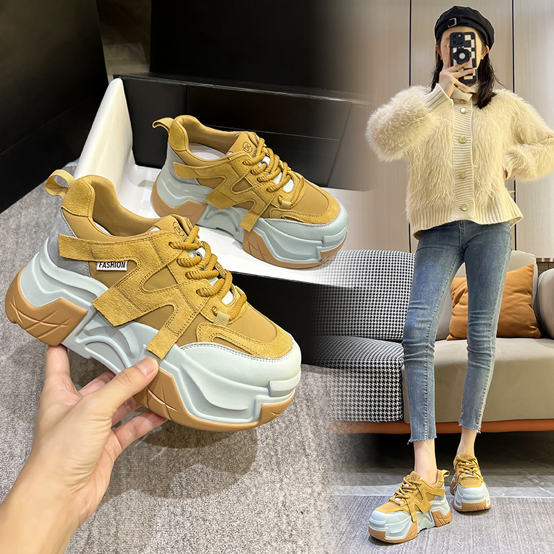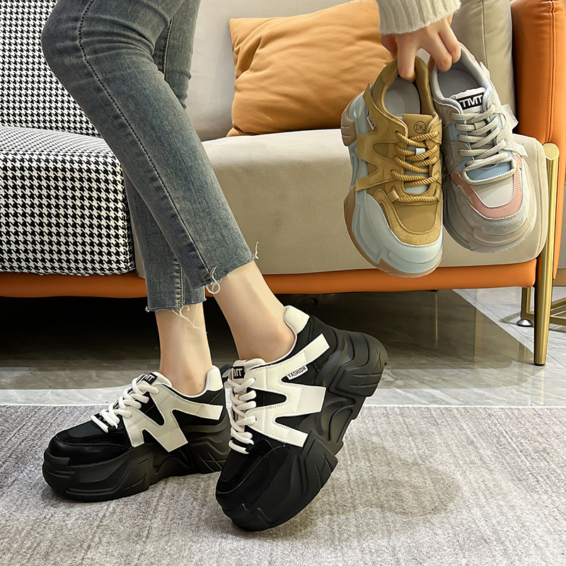 女2025春季 黑色休闲运动鞋 新款 增高显脚小ins潮鞋 时尚 厚底老爹鞋