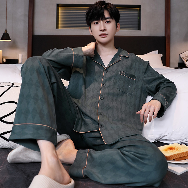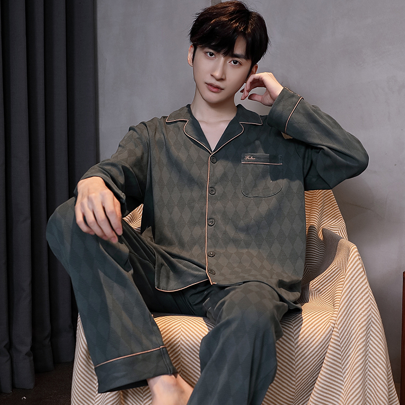 翻领中年爸爸可外穿家居服 纯棉菱形格子开衫 卡之恋睡衣男秋款 长袖
